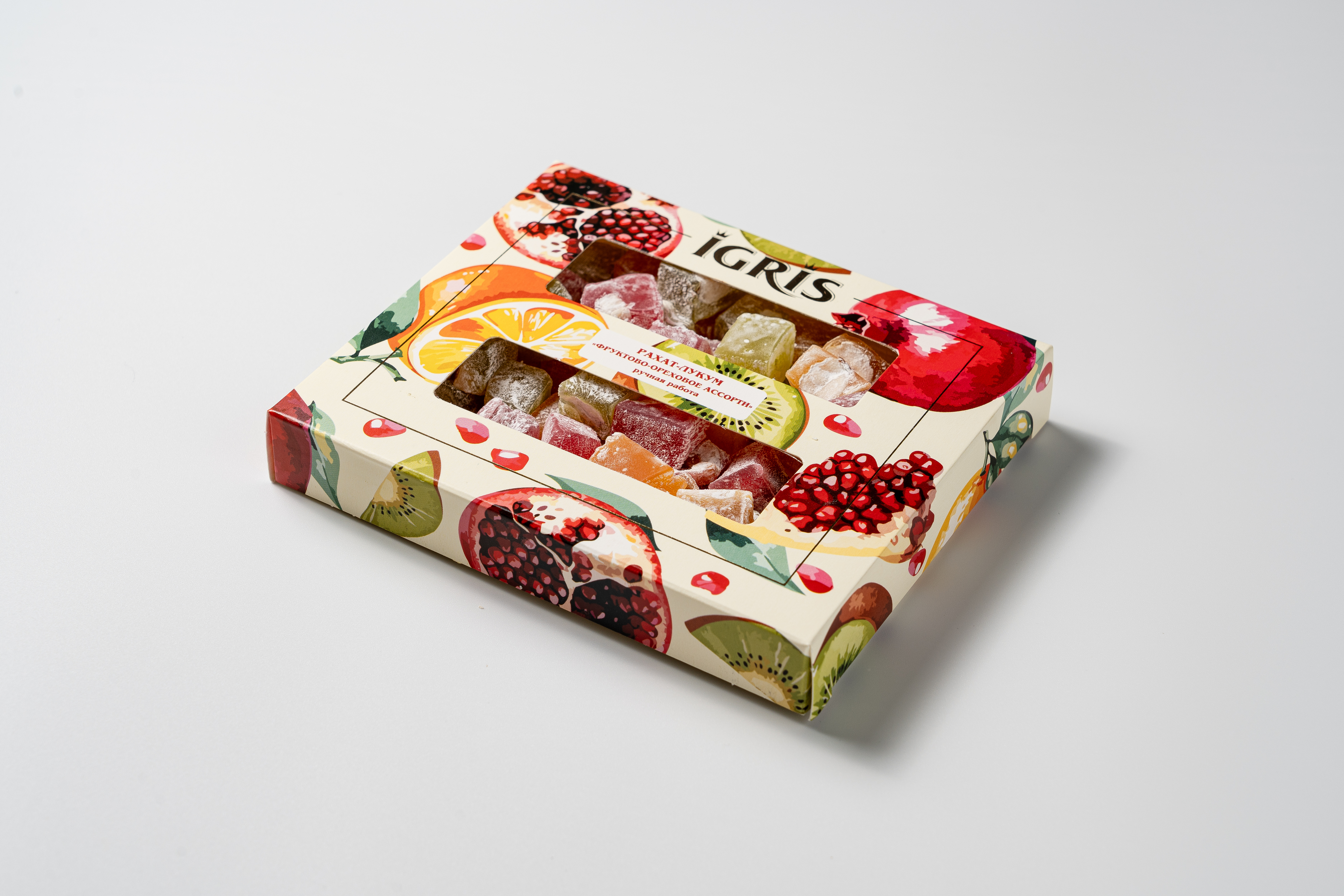 Состав: подготовленная вода, сахар, фундук жаренный загуститель - крахмал кукурузный высший сорт, патока карамельная, ваниль, регулятор кислотности - лимонная кислота, ароматизаторы идентичные натуральным: клубника, киви, апельсин пищевые красители кармуазин, тартразин, синий блестящий.
